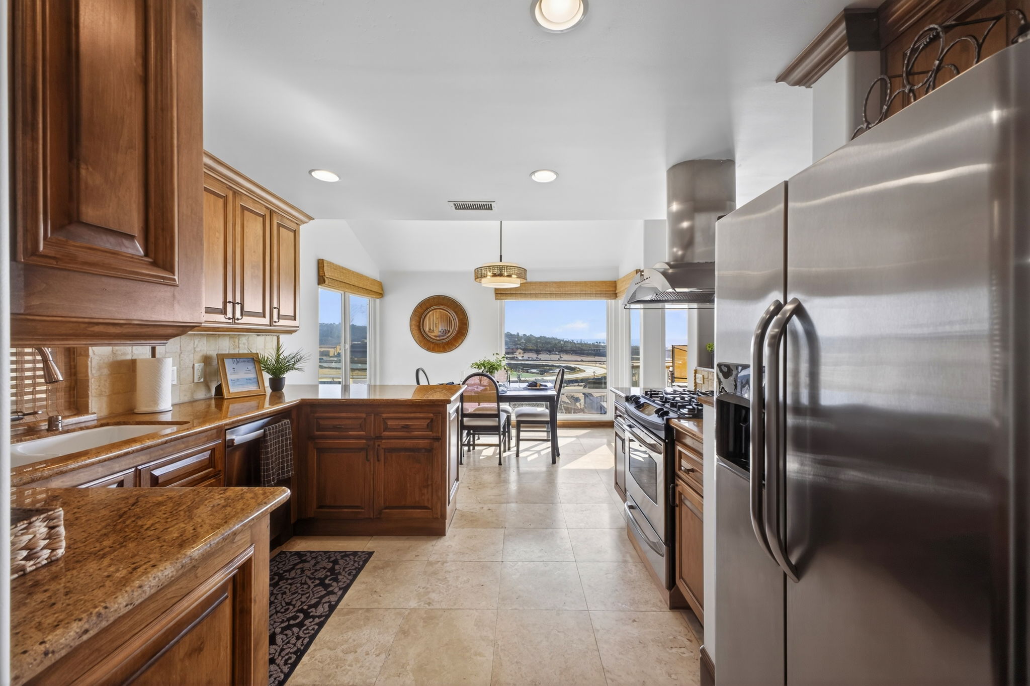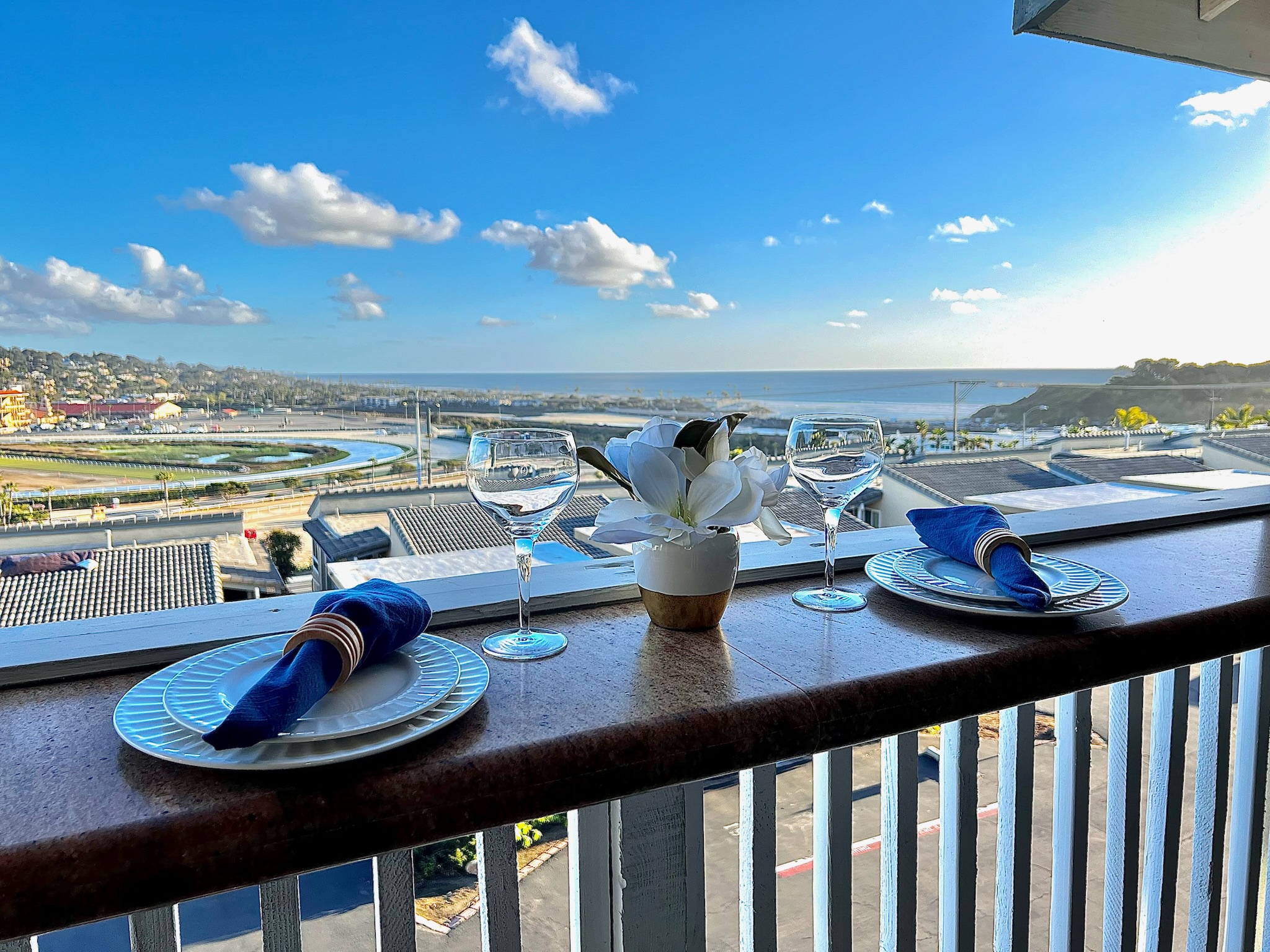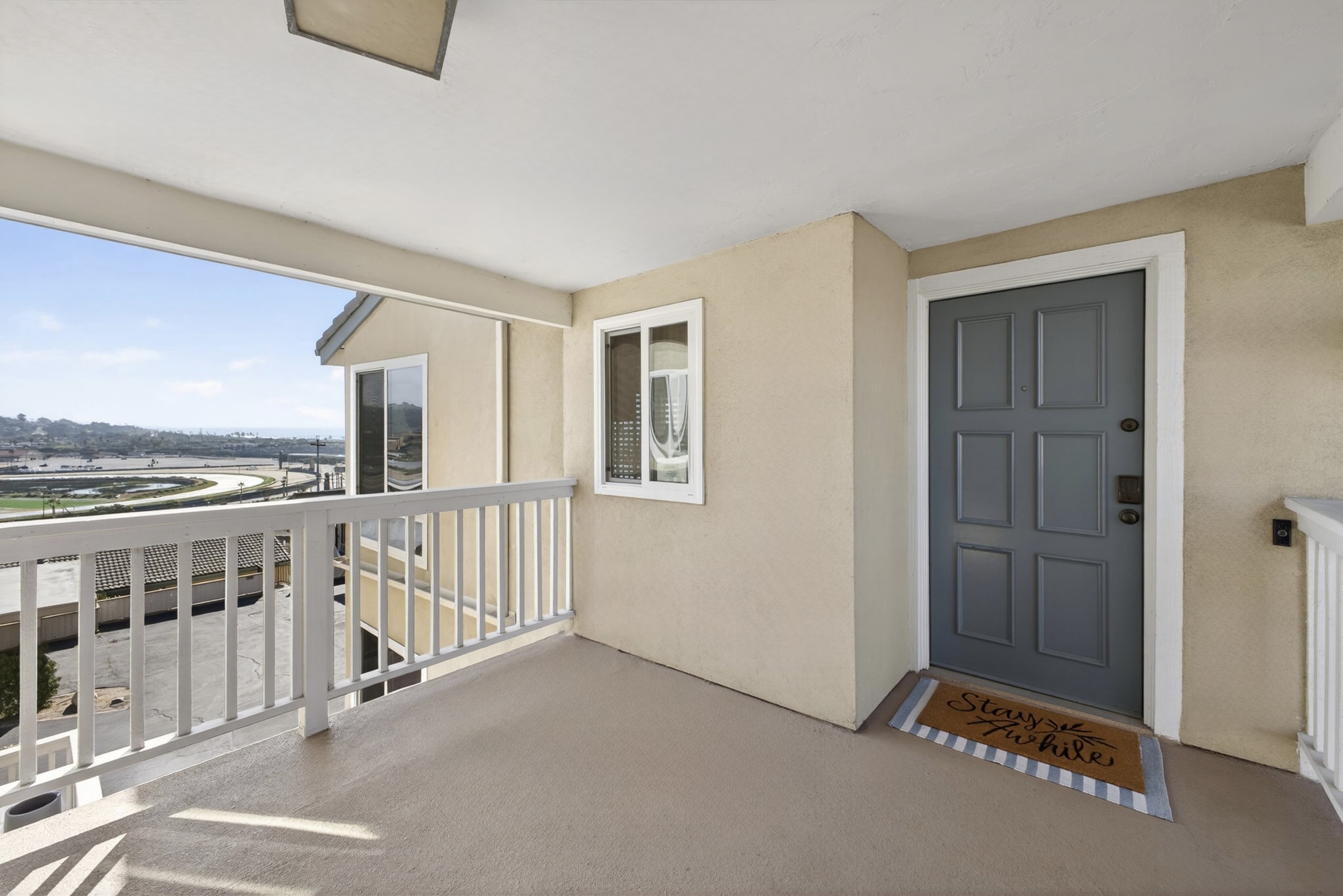 Views overlooking the Del Mar Fairgrounds and a short distance from local shops, restaurants and grocery stores.