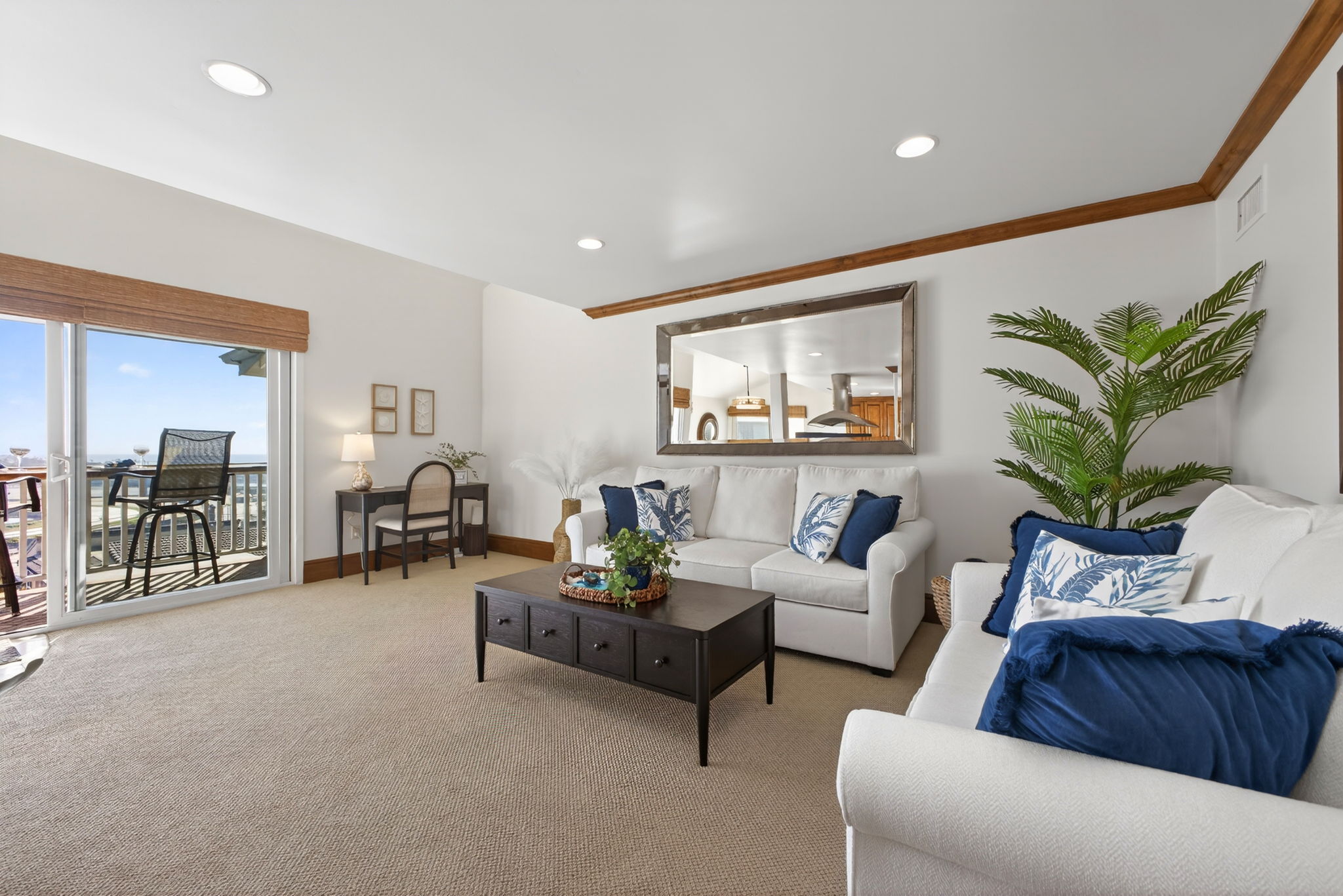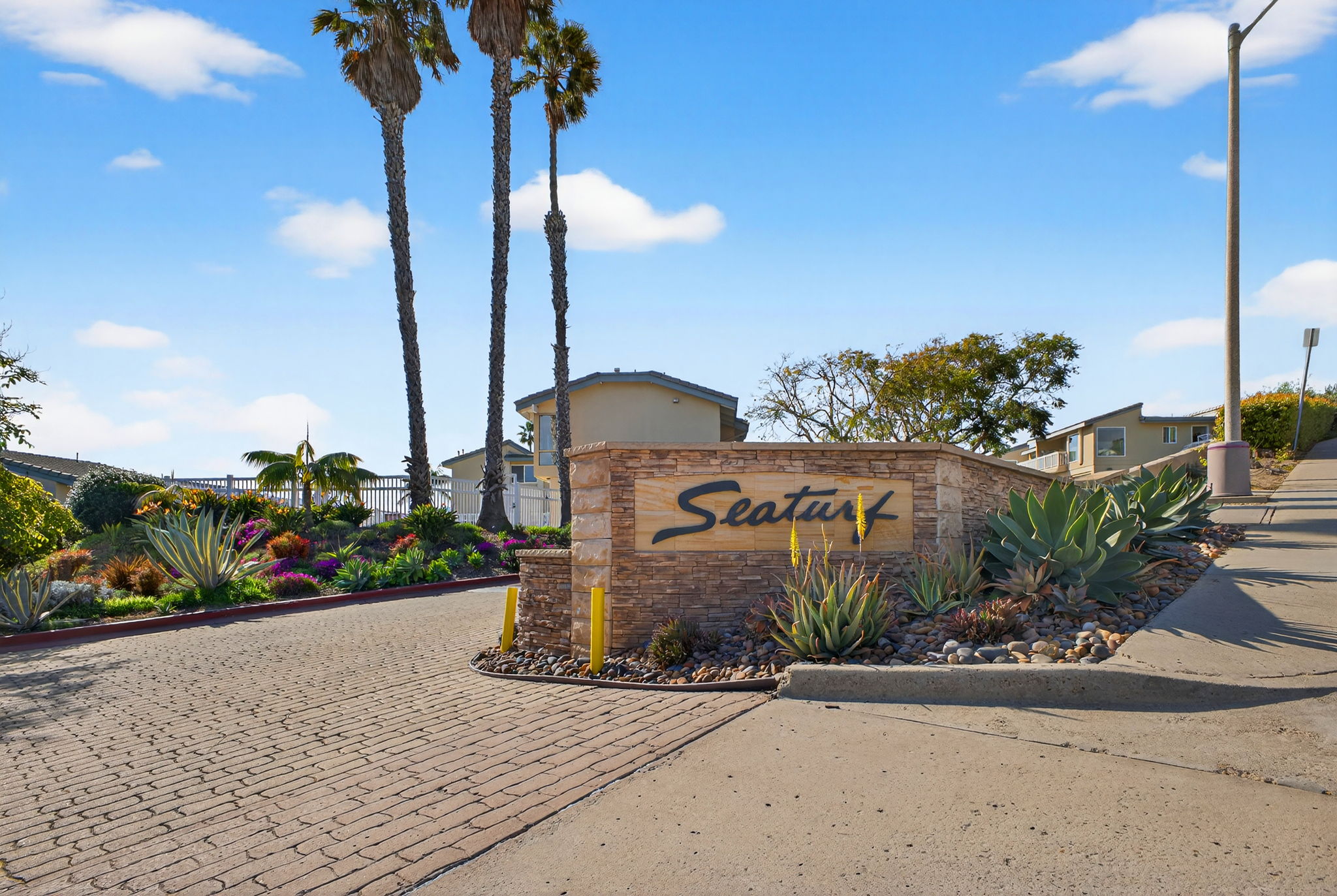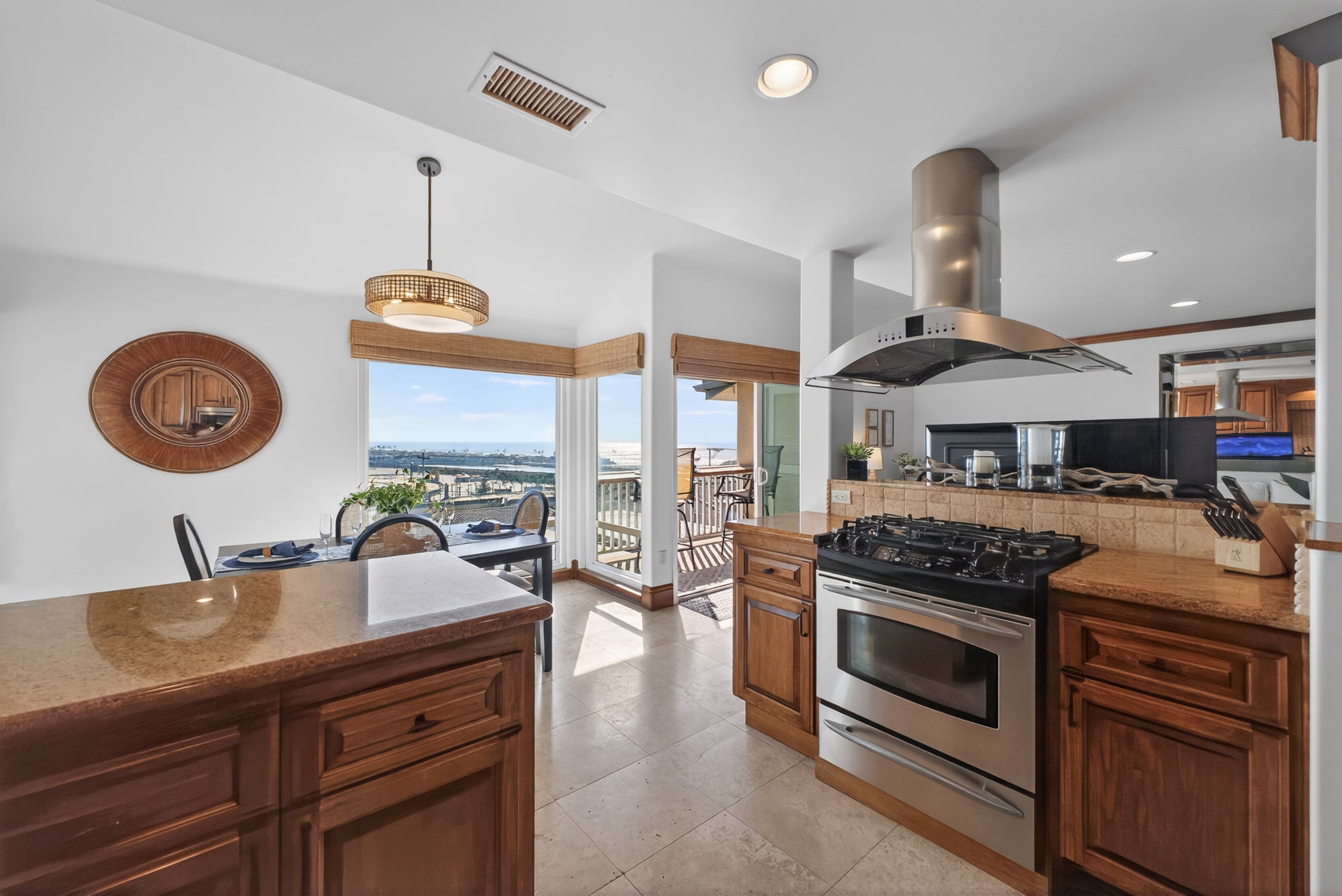 Views overlooking the Del Mar Fairgrounds and a short distance from local shops, restaurants and grocery stores.